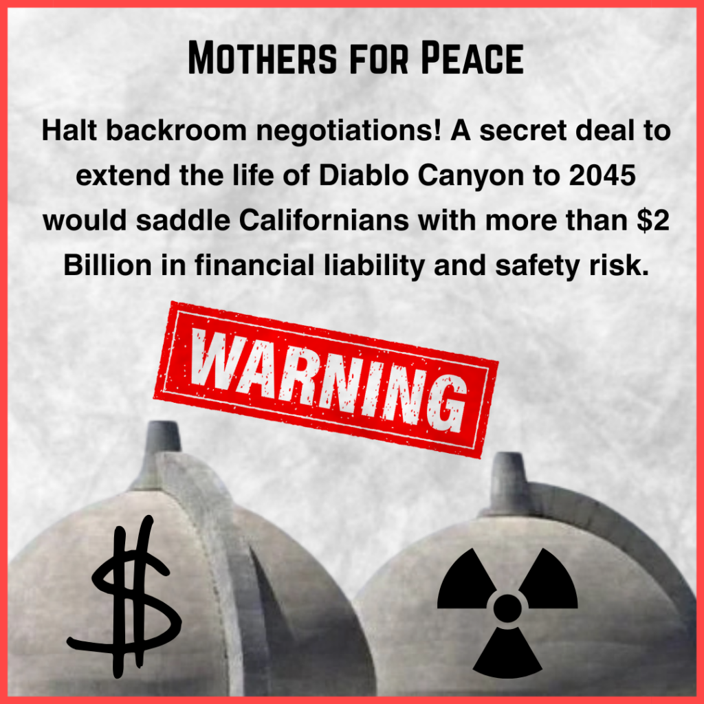 Mothers for Peace and its allies call on California Governor Newsom, Speaker Rivas and Pro Tem Limón and Legislators to halt backroom negotiations and hold full public hearings before any vote to extend the nuclear plant’s life to 2045.