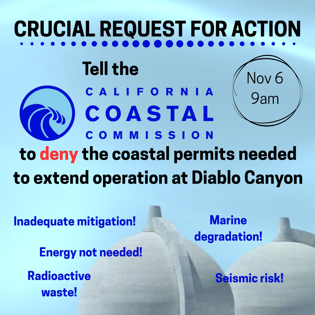 The California Coastal Commission is one of the few remaining venues to stop the extended operation of Diablo Canyon, so this request for action is crucial. The Coastal Commission (CCC) is holding a hearing in Sacramento on Thursday, Nov 6, 9am. PG&E requires a Consistency Certification (federal permit) and a Coastal Development Permit (state permit) from the…
