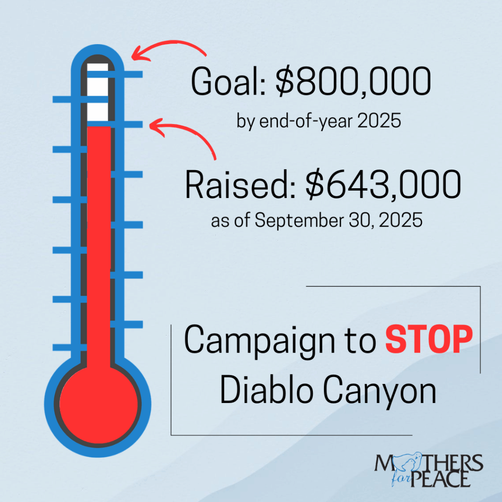 Donations are needed to pay for our attorneys, consultants, and expert witnesses. You can make a tax-deductible one-time or monthly donation online or mail checks to: San Luis Obispo Mothers for Peace, PO Box 3608, San Luis Obispo, CA 93403