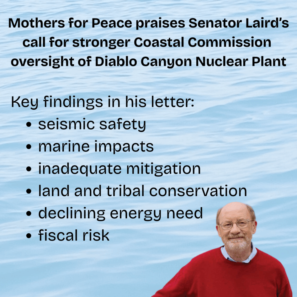 Mothers for Peace strongly supports California State Senator John Laird’s October 23rd letter to the California Coastal Commission demanding a rigorous, transparent and safety-driven review of PG&E’s application to extend operations at the Diablo Canyon Nuclear Plant.