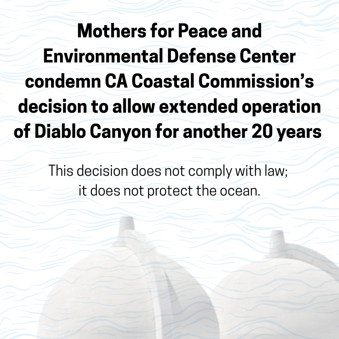 Continue Reading December 11, 2025: Mothers for Peace and Environmental Defense Center condemn CA Coastal Commissions decision to allow for the extended operation of Diablo Canyon for another 20 years